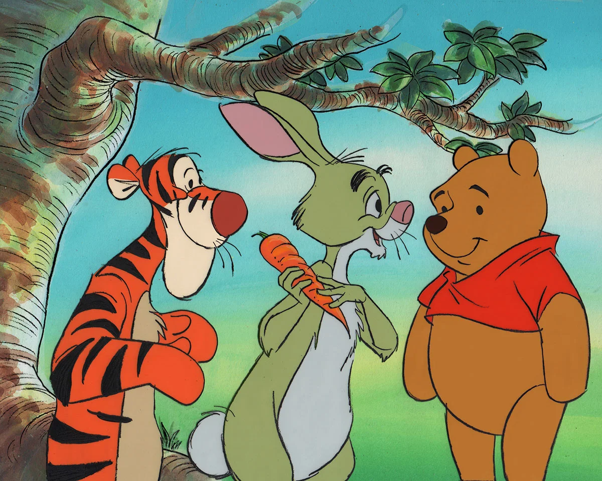 Comic Mint is pleased to offer Disney fans this beautiful production cel setup of Winnie the Pooh, Tigger and Rabbit (holding a carrot) in the 100 Acre Wood. (Walt Disney, c. 1970s-80s).